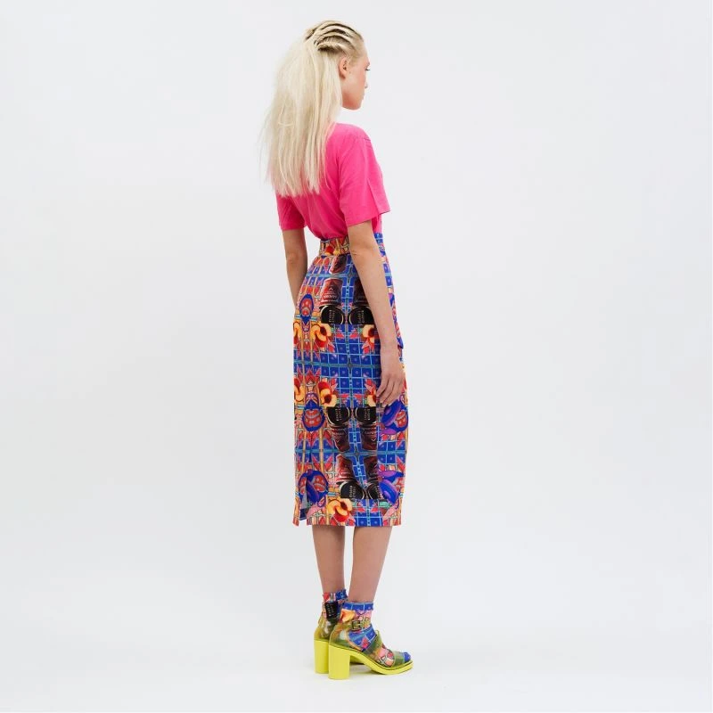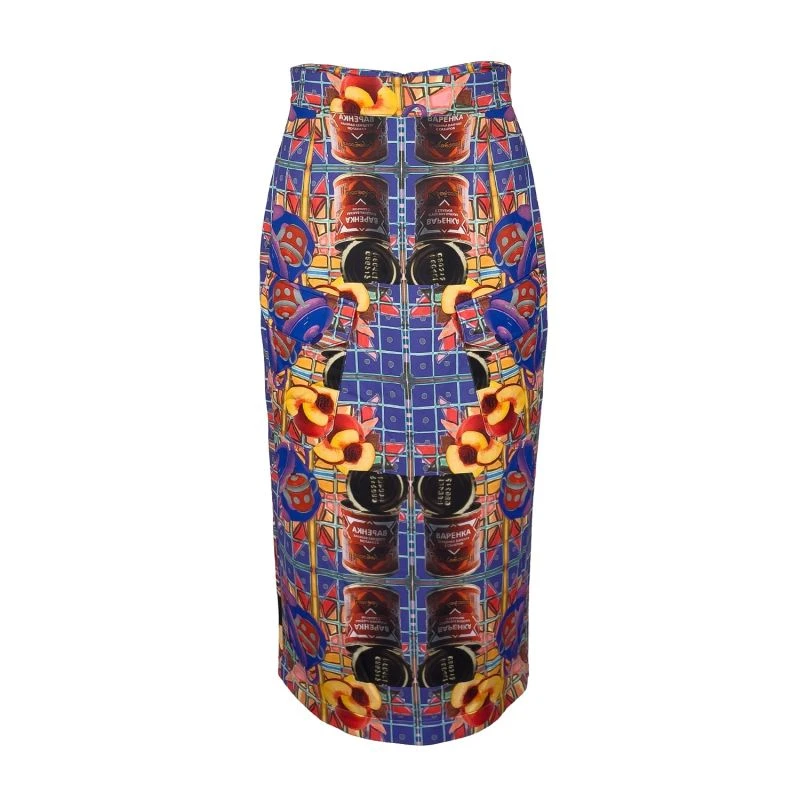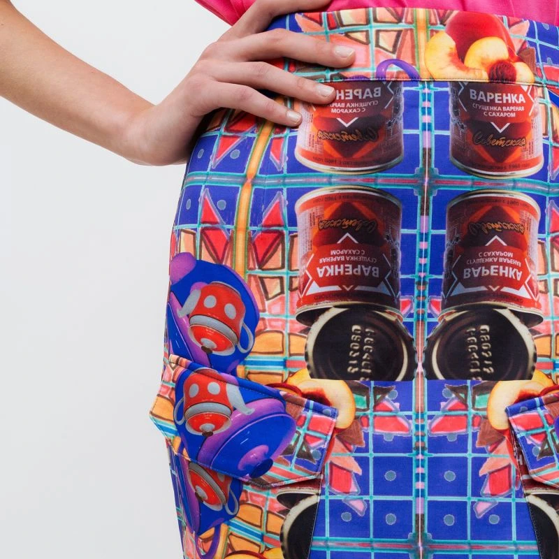 The “Waxcloth” pencil skirt with geometrical front pockets is a stylish and modern addition to your wardrobe. The all-over print features a reference from Laima Jurča collection “Piecgades ģenerālmēģinājums”. The over the knee pencil skirt fit provides a sleek and sophisticated look. Made from a “Sandwich” jersey fabric – the inside is composed of cotton 60% and the outside is made of polyester 40%, making it lightweight, breathable and does not wrinkle. The elastic fabric ensures a perfect fit and allows for ease of movement. The geometrical front pockets add a touch of edginess to the skirt. This skirt is perfect for pairing with a blouse or sweater for a professional look, or with a t-shirt for a more casual style.