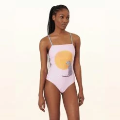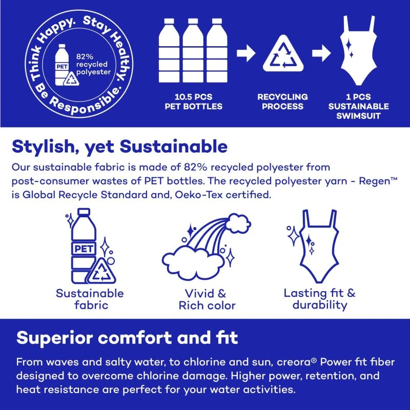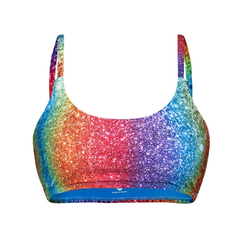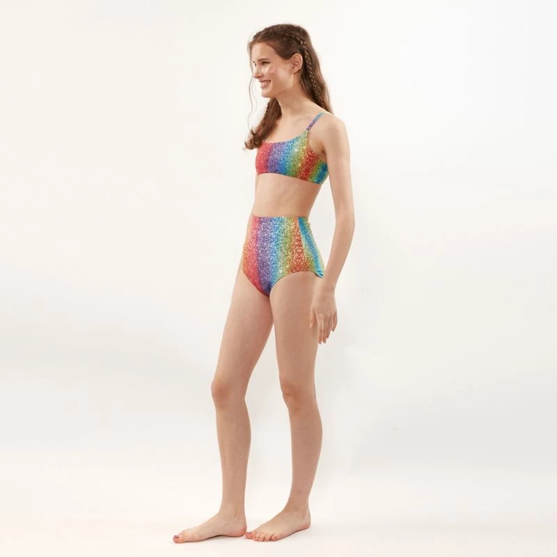 Elevate your swimwear collection with our dazzling rainbow glitter-print bikini top, thoughtfully crafted from recycled post-consumer water bottles. Create a complete look by pairing it with the matching bikini bottom from our collection and adding a touch of romance with our rose pink Jenny Crop Top. This ensemble not only radiates summer charm but also provides protection against the sun’s harmful rays.