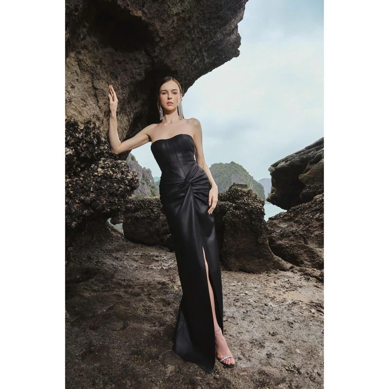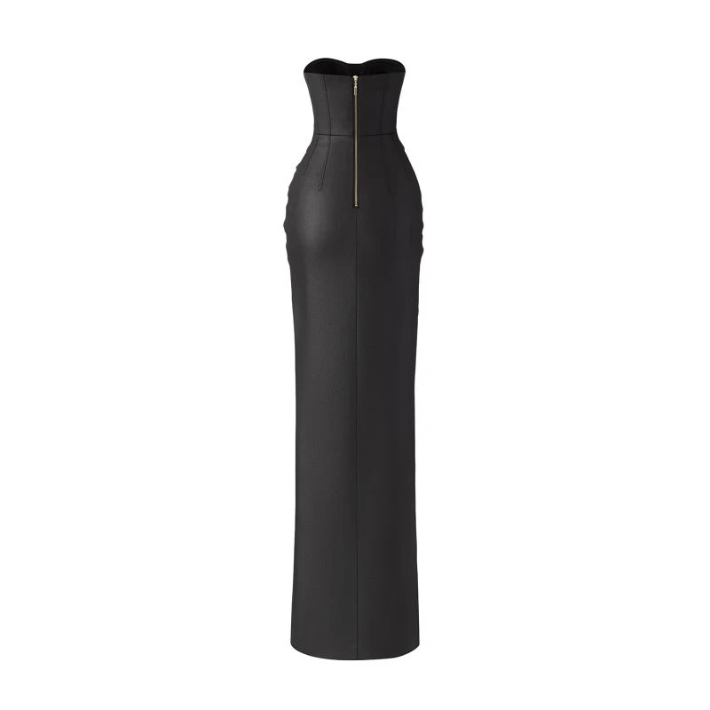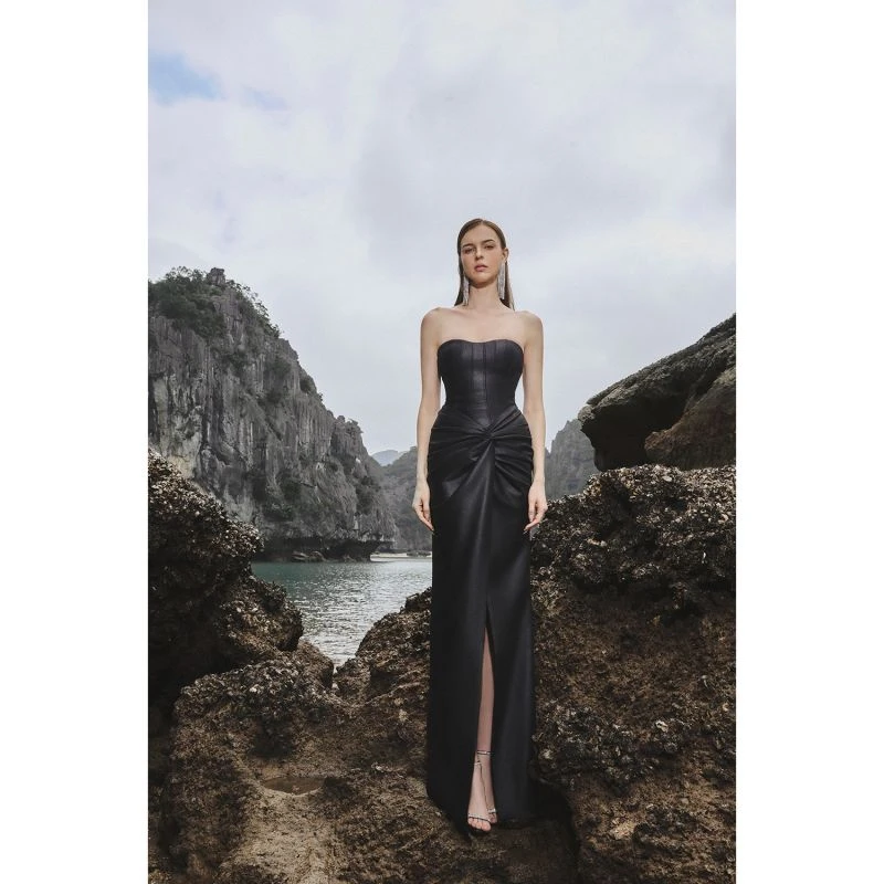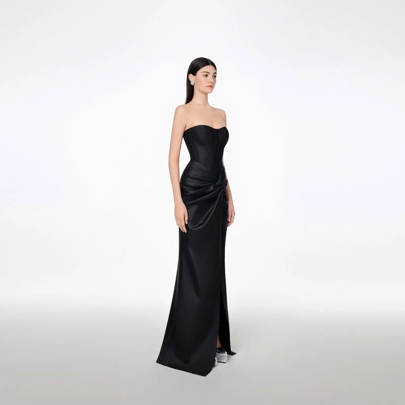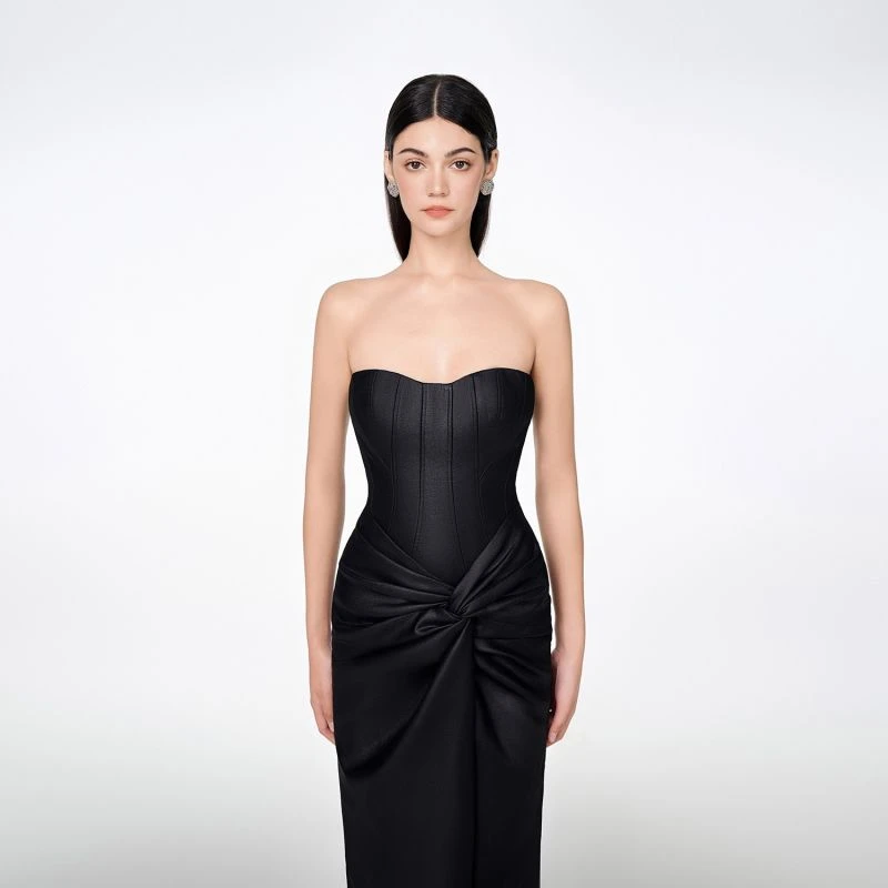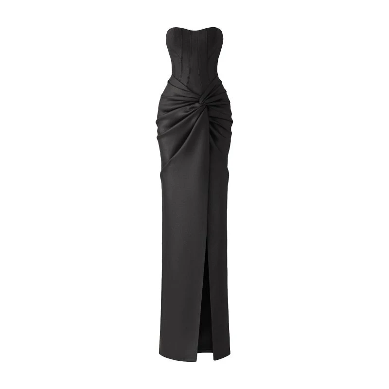 The strapless, knotted, slit dress is a popular fashion choice for those looking to make a statement. This dress typically features a fitted bodice with no straps, showcasing the shoulders and collarbone. The knotted detail at the waist accentuates the natural curves of the body and adds an interesting visual element. This dress is a versatile choice that can be worn to a variety of events, from a formal wedding to a night out on the town. It can be dressed up with heels and statement jewelry or dressed down with sandals and a denim jacket.