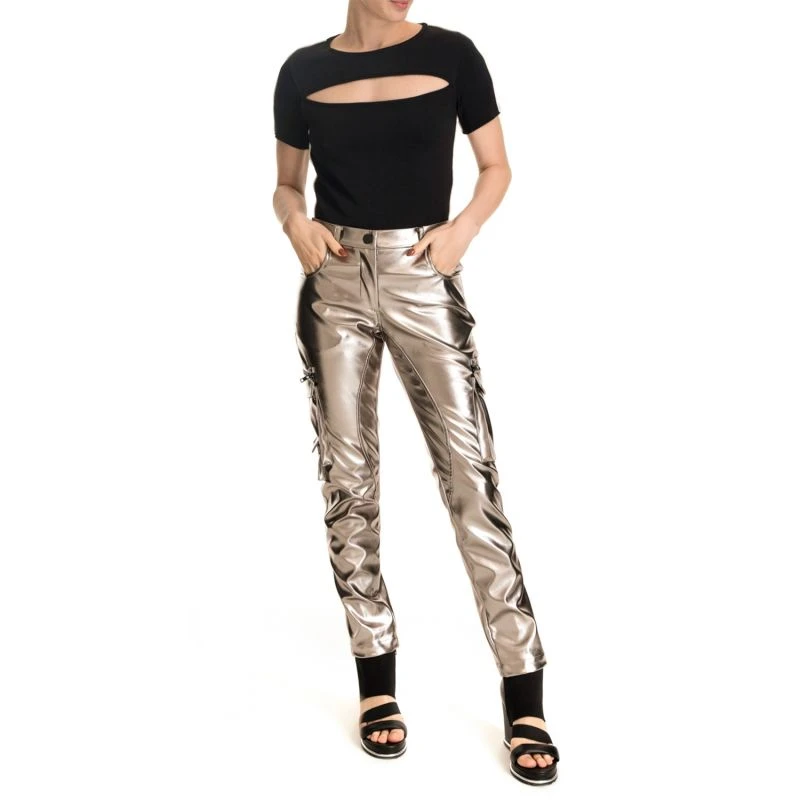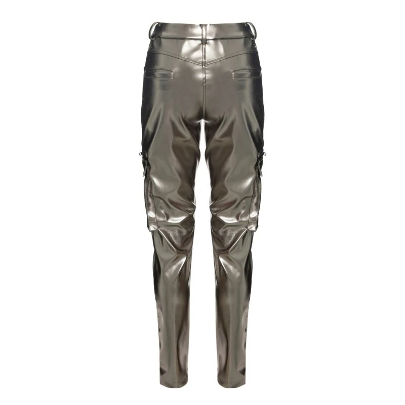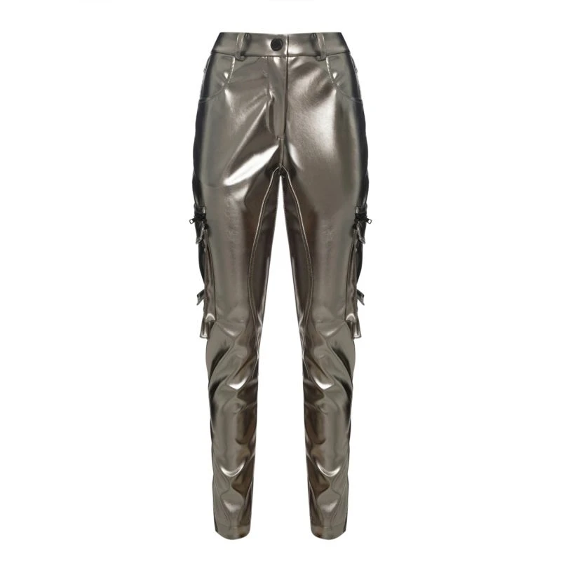 Product Details-Tech Pelle Pocket Pants in Graphite, made in a metallic fabric that resembles leather. A highlight for the side pockets with bellows, lapel, and tractor zipper overlapping a smaller pocket detail. The pants have cutouts that enhance the feminine silhouette and wearability.
