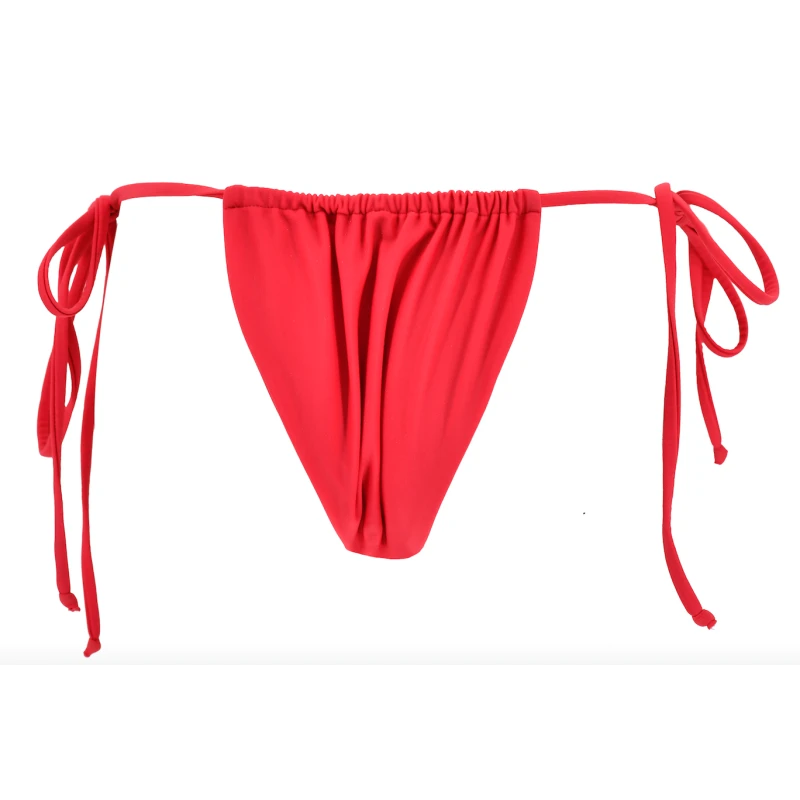 The Bailey Bottom is a side tie bikini bottom. The fabric fit in front and back can be spread out aganst the strings for more coverage, or rouched together. The rich solid red fabric is embellished in white embroidered flowers with beaded centers.