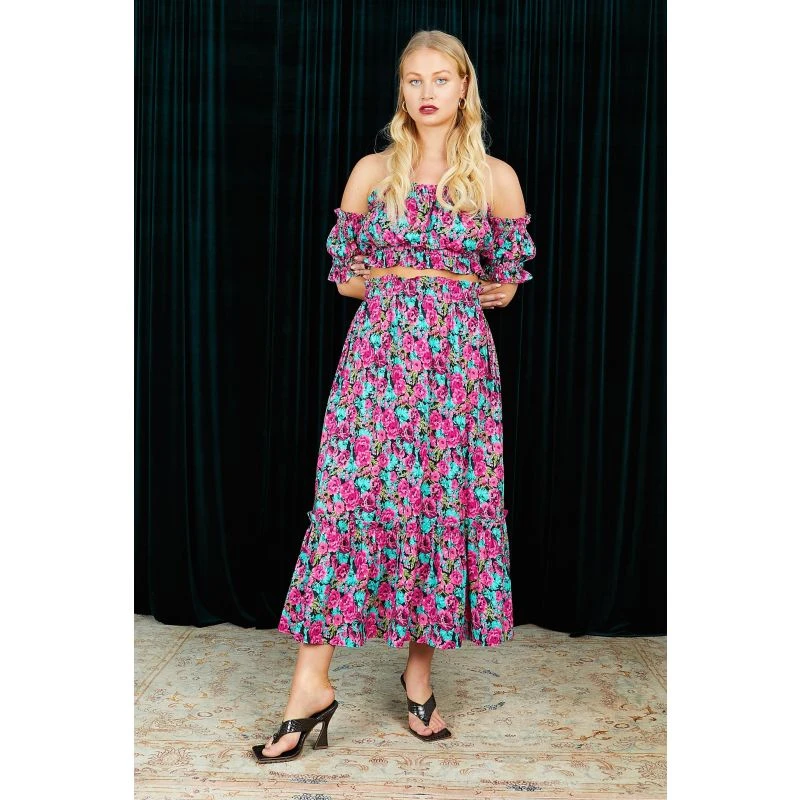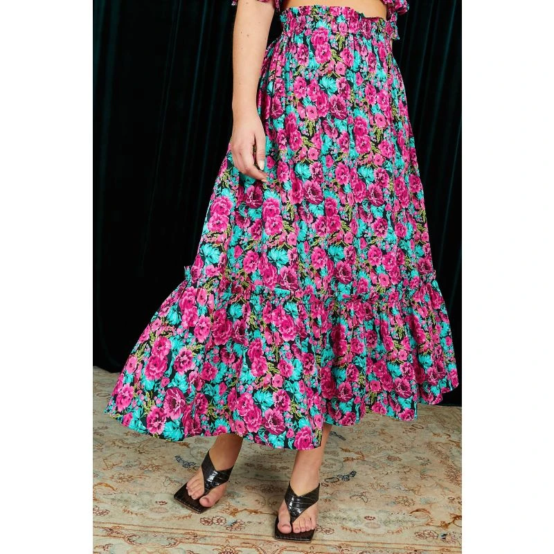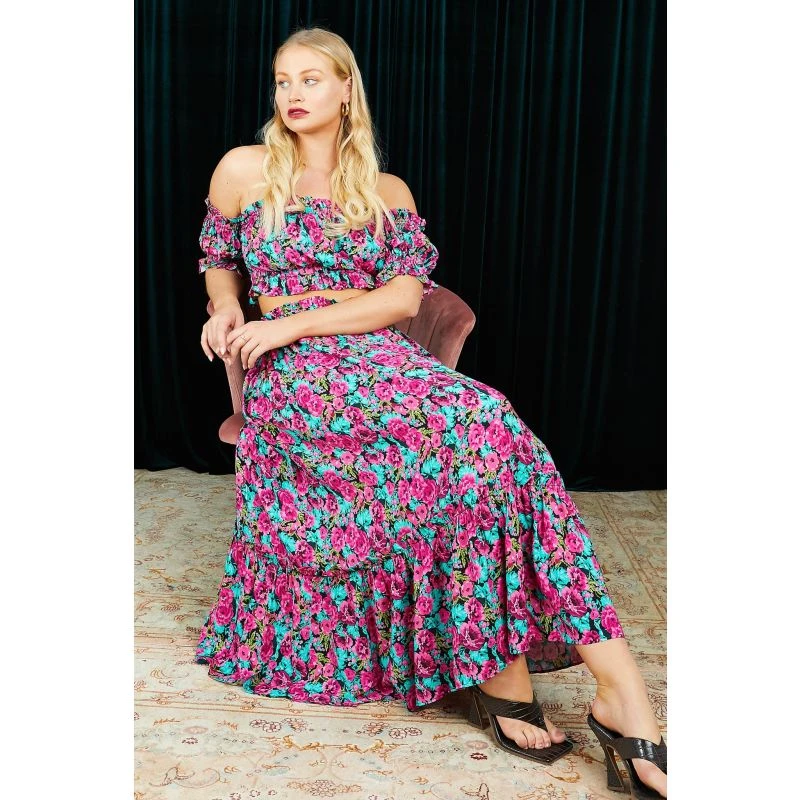 The Evelyn top and Sofia skirt feature a striking pink and teal floral inspired by 70s vintage dress prints. Printed on a viscose fabric with a dry finish and soft drape.