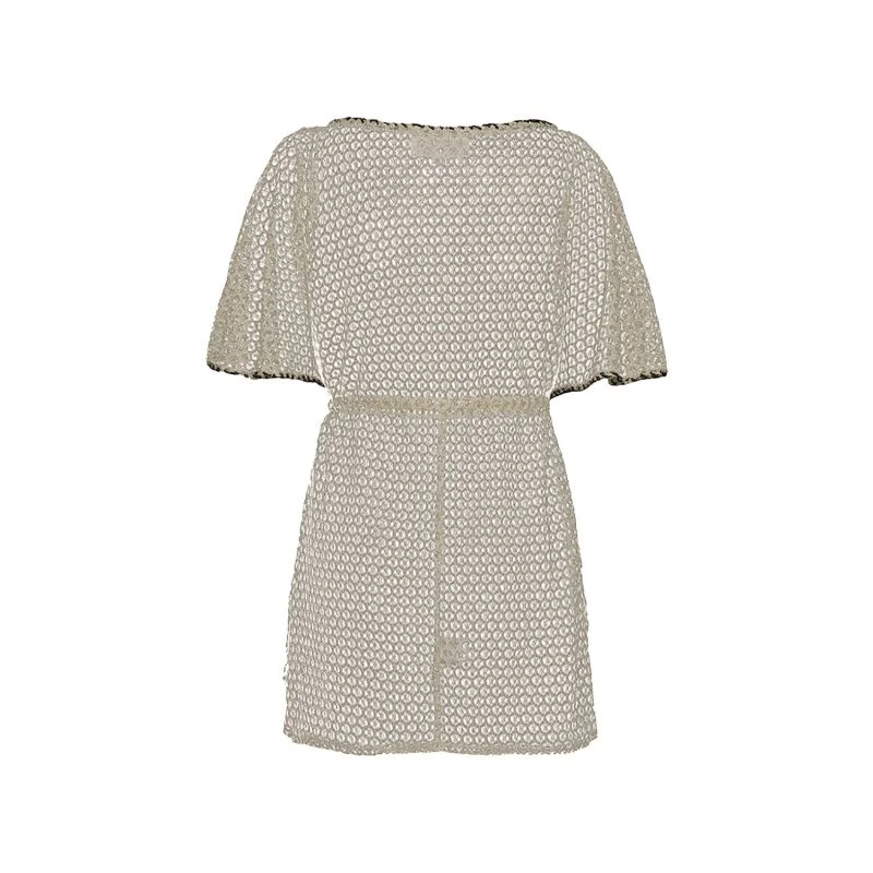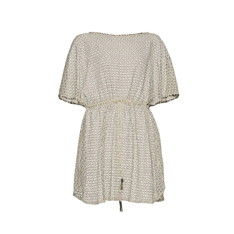 The beautiful Sun Spell is made from a soft cream lace with a unique and delicate shimmering gold pattern. The material is set off against a contrasting gold/bronze beaded edge trim. Perfect for covering up, it can be worn over any swimwear to create an effortless chic, bohemian beach style. The fine translucent fabric falls in delicate folds around the body, while the drawstring tie emphasises and flatters the waist. Hand stitched gold beads adorn the edges of this one-size-fits-all cover up which also comes in a Maxi version. Worn barefoot in the day or over a slip dress in the evening, the Sun Spell is sure to create an elegant look. The long rope tie is finished off with golden beaded tassels which perfectly complement the contrasting delicacy of the lace.