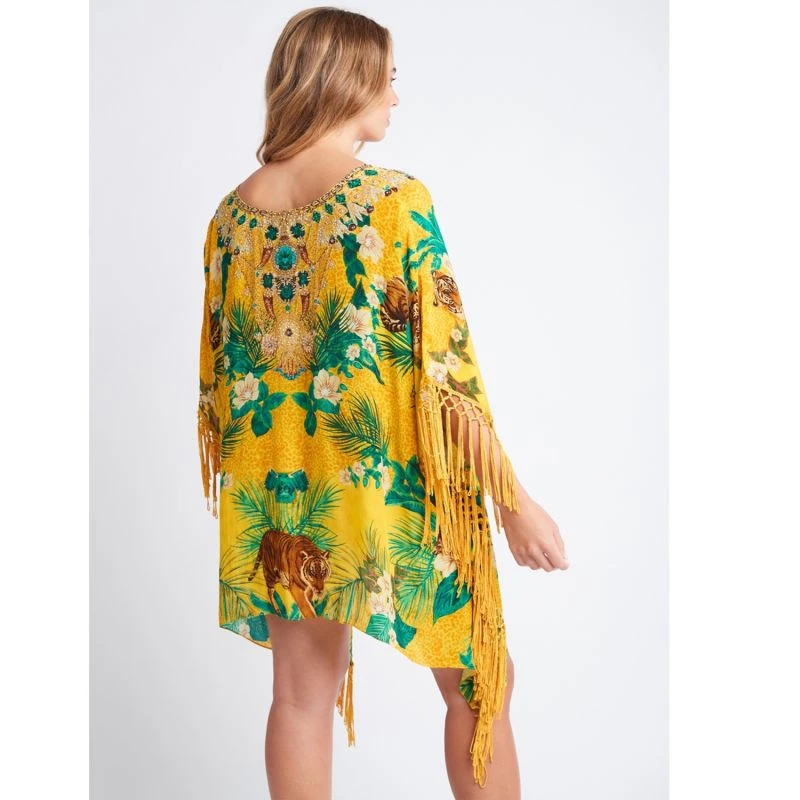 Loose yourself in the memory of a time when sweet bohemia ruled with this ode to the original bohemian girls of the 1970’s. The Tropical Tropical Tigress Kaftan Top w Fringe features a flattering lace up neckline with luxurious hand applied crystal detailing. Oversized sleeves with fringing make this piece a stand out. Style as a top with Maxi Skirts and Trousers, or own it’s own as a Short Dress. The perfect style that can take you effortlessly from from day to night.