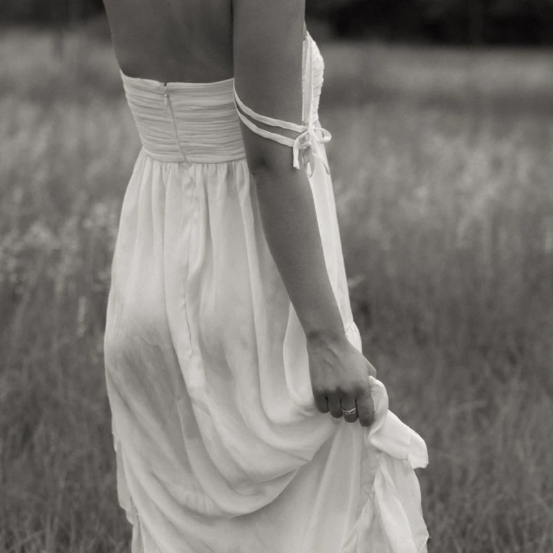 Meet Darlene. Darlene is a babydoll style dress with a short skirt in the front and a full length, dramatic train in the back. Made with a creamy white satin fabric, fully lined, and a hidden zipper in the back. The straps are completely versatile allowing you to wear it as spaghetti straps, halter or off the shoulder. Mini dress or full length? Who says you can’t have a bit of both.