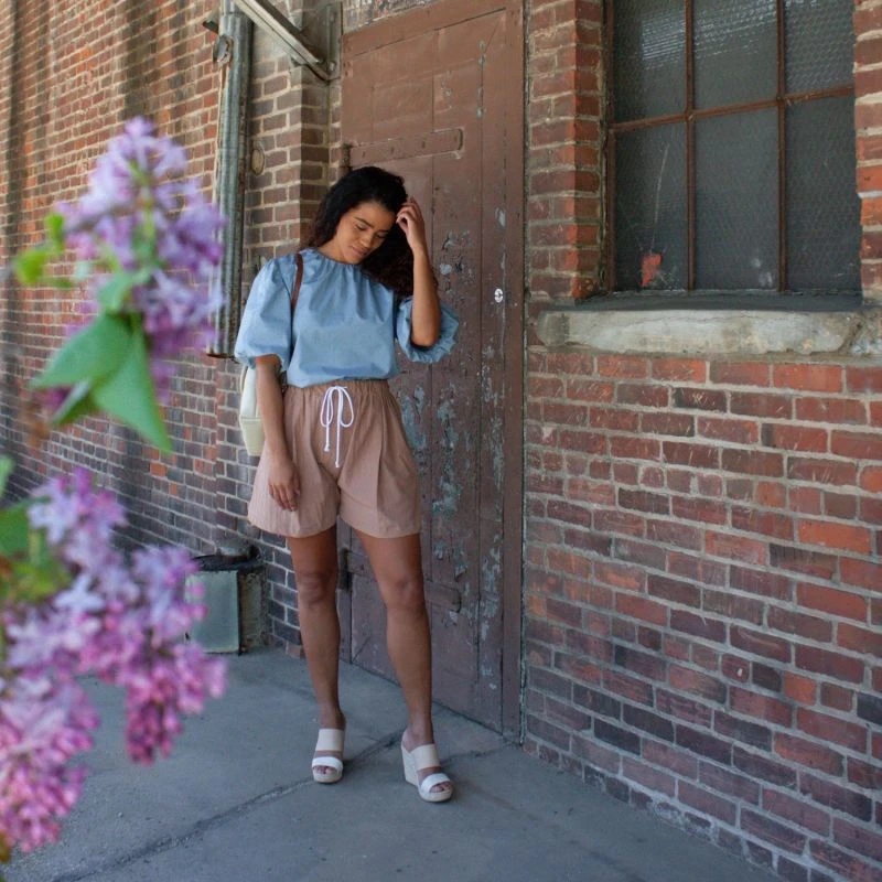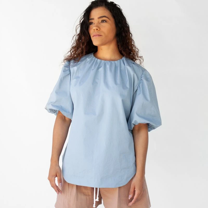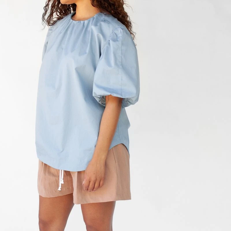 The Puff Sleeve Gathered Top is an easy cotton pullover blouse in a flowy silhouette. The exaggerated sleeves give a special touch to this top. The top features some gathers at the neckline while dropping into an A-line silhouette ending with a thoughtful hi-lo hemline at the sides. Some raw hem details add contrast to the femininity of this blouse. Lots of little details are packed into this top.