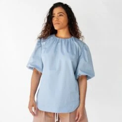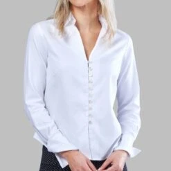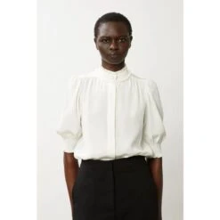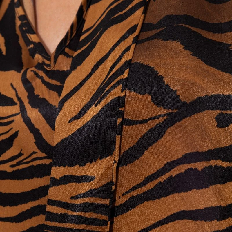 The product has printed fabric with satin effect. It has long sleeves and deep v neckline. The shirt is designed with neckline scarf.